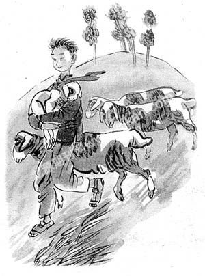 谁知老山羊还以为是赶它们去吃草呢,带着羊群出了院门向山坡跑去。小宝一下子急了,跑到老山羊面前,抓住它的角使劲往回拽,可老山羊的力气太大了,它倔强地就是把头扭向山坡的方向。