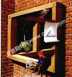 有三处错误:画中窗户的组合是错误的;坐着的人手中拿的立方体是不可能存在的;纸上画的三角形也是错误的。