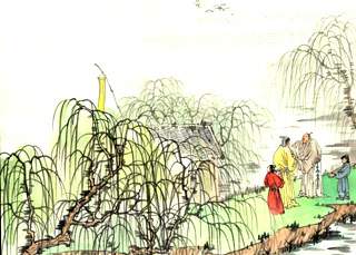 前两句写送别的时间,地点,环境气氛。清晨,渭城客舍,自东向西一直延伸、不见尽头的驿道,客舍周围、驿道两旁的柳树。这一切,都仿佛是极平常的眼前景,读来却风光如画,抒情气氛浓郁。“朝雨”在这里扮演了一个重要的角色。 早晨的雨下得不长,刚刚润湿尘土就停了。从长安西去的大道上,平日车马交驰,尘上飞扬,而现在,朝雨乍停,天气清朗,道路显得洁净、清爽。“浥轻尘”的“浥”字是湿润的意思,在这里用得很有分寸,显出这雨澄尘而不湿路,恰到好处,仿佛天从人愿,特意为远行的人安排一条轻尘不扬的道路。客舍,本是羁旅者的伴侣;杨柳,更是离别的象征。选取这两件事物,自然有意关合送别。它们通常总是和羁愁别恨联结在一起而呈现出黯然销魂的情调。而今天,却因一场朝雨的洒洗而别具明朗清新的风貌──“客舍青青柳色新”。平日路尘飞扬,路旁柳色不免笼罩着灰蒙蒙的尘雾,一场朝雨,才重新洗出它那青翠的本色,所以说“新”,又因柳色之新,映照出客舍青青来。总之,从清朗的天宇,到洁净的道路,从青青的客舍,到翠绿的杨柳,构成了一幅色调清新明朗的图景,为这场送别提供了典型的自然环境。这是一场深情的离别,但却不是黯然销魂的离别。相反地,倒是透露出一种轻快而富于希望的情调。“轻尘”、“青青”、“新”等词语,声韵轻柔明快,加强了读者的这种感受。