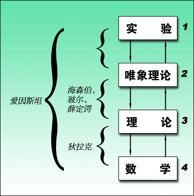 狄拉克最重要的贡献是提出了狄拉克方程。海森堡最重要的贡献是海森堡方程,是量子力学的基础。可是写出这两个方程的途径却截然不同:海森堡的灵感来自他对实验结果(1)与唯象理论(2)的认识,进而在摸索中得到了海森堡矩阵方程式。狄拉克的灵感来自他对数学(4)的美的直觉欣赏,进而天才地写出他的方程—狄拉克方程。他们二人的喜好和注意的方向不同,所以他们的工作的领域也不一样,如图2所示。此图也标明玻尔、薛定谔和爱因斯坦的研究领域。爱因斯坦兴趣广泛,在许多领域中,自(2)至(3)至(4),都曾做出划时代的贡献。 ![]() 尽管理论科学家不亲自在实验室进行实验,但他们必须提出验证科学假说的实验方法。通常他们根据新的假说或者已有的科学原理进行实验设计,以头脑思维的方式展开和完成实验过程。这种实验称为思想实验。 爱因斯坦与玻尔关于量子理论的概率与不确定性解释和因果与决定性解释的争论中,双方就多次应用思想实验。 在第五届索尔威会议上,爱因斯坦企图用一些理想实验来反驳测不准原理。首先,他设计了一个让电子通过单狭缝绕射的实验,认为这个实验可以提供一个精确的时空坐标,同时又能提供对此过程中能量和动量交换平衡的详细说明。然而,玻尔很快的指出,他不能避免在测量时仪器对电子的干扰,即电子与狭缝边缘的相互作用。爱因斯坦见单狭缝难不倒玻尔,又想出了新的实验。他承认用确定位置坐标的同一系统来精确测量动量是不可能的,所以他以分开的装置,一个测位置,一个测动量。他设计了一个电子通过双狭缝干涉的实验, 当双狭缝开启时,从屏幕出现的亮点可以知道电子垂直方向的动量,分别关上其中一个狭缝, 就可以知道电子的确实位置。然而玻尔在仔细思考后发现,如果关上其中任何一个狭缝,实验的状态就完全改变了。当双狭缝开启时,即便电子一个个发射出来,最后仍会在屏上形成干涉条纹。假如轮流开启一个狭缝,虽然可以得知电子究竟经过那个狭缝,但最后却不会再有干涉条纹了。就这样,这个本来是爱因斯坦用来反驳量子力学的理想实验,经由玻尔 的解释在今日已成了说明测不准关系和互补原理的标准范例。 在3年后的第六届索尔威会议上,爱因斯坦在黑板上画了一个盒子,盒上有一个小孔,可由快门来启闭.快门则由盒中的时钟机械置来控制,小盒的重量是可以测量的.盒中装有一些辐射物质。我们可以调节快门使得刚好放出一个粒子之后就关闭。透过时钟,可以精确的量出粒子放出的时间。另外,测量粒子放出后盒子的重量,我们也可以知道粒子的质量.经由爱因斯坦的质能公式 E=mc2,能量也可以准确地计算出来,于是违反了测不准关系。这就是著名的爱因斯坦光盒实验.由于实验根本不涉及观测仪器的问题,根本没有外来粒子会改变粒子的运动.所以测不准关系破灭了,因果律和准确性都恢复了。 玻尔遇到了严重的挑战,无法马上找到问题的答案。他和他的同事一夜未眠,检查实验的每一个细节,想要找出爱因斯坦到底错在那里。经过通宵的奋战之后,玻尔终于找出了反驳爱因斯坦的办法。第二天,玻尔也在黑板上画了一个草图,但和爱因斯坦 不同的是,他给出称量小盒重量的方法。他用弹簧把小盒吊起来,盒上有一指针,可以沿固定在支架上的标尺移动,这样就可以读出小盒在粒子跑出前后的重量了。玻尔请大家回忆 爱因斯坦 的广义相对论中的等效原理:当时钟在重力场中发生位移时,它的快慢会发生变化。当粒子跑出盒子而导致盒子重量变化时,盒子将在重力场中移动一段距离,这样子读出的时间也会有所改变,因而导出测不准关系。这是广义相对论中著名的红位移公式,表示一个在重力场中移动的时钟,在移过一个位势差时在某个时间内时钟快慢的改变,玻尔随即用红位移公式导出了测不准关系。 爱因斯坦不得不承认玻尔的推论是无懈可击的。他自己在设计这个理想实验的时候,居然没有考虑到广义相对论的效应。玻尔用爱因斯坦的相对论驳倒了他本人,取得了第二回合的胜利。玻尔的胜利获得了大多数物理学家的赞同,哥本哈根解释也被奉为是量子力学的正统解释。 科学实验的类型有多种分类方法。按实验的学科领域,可以分为物理实验、化学实验、生物实验等等;按实验所处的环境,可以分为实验室实验(室内实验)和自然实验(室外实验);按实验中质与量的关系,可以分为定量实验、定性实验和结构分析实验;按实验的步骤可以分为预备性实验、决断性实验和正式实验;按实验在科学认识中的作用,可以分为析因实验、对照实验、模拟试验;按实验的对象,可以分为物的实验、动物实验和人的实验。按实验的直接目的可以分为探索性实验和判决性实验。判决性试验是指这个实验的结果可以决定一个假说和理论的命运,如迈克耳孙(A.A.Michelson,1852-1931)—莫雷(E.Morley,1838-1923)实验。探索性实验是对一个全新的领域的预备性探讨。或者说科学实验有两个目的:一是观察迄今未知的或者未加解释的新事实,一是判断未某一理论提出的假说是否符合大量可观察到的事实。有时这两个目的是互不相干的,有时又殊途同归。 一个具体的科学实验可以简单地分为5个步骤。首先,科学家必须掌握问题的有关理论基础,即实验科学家也需要一定的理论作指导。其次,进行实验方案的制定与设计。第三,实验仪器