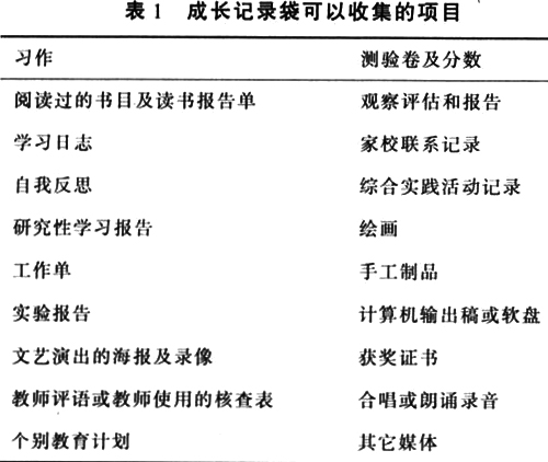 就具体形式而言,成长记录袋收集的东西以特殊儿童作品为主,其它各种有关资料,只要符合评价目的,能反映特定领域中特殊儿童的成就、努力与进步,也可以予以收集。表1列举了在某次特殊学校校长研讨会上与会者列举出来的可以收入成长记录袋的项目。需要指出的是,成长记录袋不只是装满各种材料的容器,它是对特殊儿童作品及相关证据的有系统、有组织的收集。因此,教师在设计和应用成长记录袋时必须注意:①所收集的每一项目都要有简要的说明,标明完成的日期及相关信息;②要依据使用的目的或项目形式,将成长记录袋内容分门别类地加以组织;③必要时创建和使用分领域的专门的成长记录袋(如艺术作品成长记录袋);④要充分考虑成长记录袋的保存以及与相关人员分享的问题。