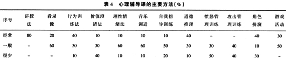 从表4中可以发现,调查的学校中有80%的学校主要采用讲授法,愤怒与攻击的训练并没有得到应有的重视。这与我国心理辅导的现状有关,重视普通学校学生的心理辅导,忽视特殊学校学生的心理辅导。而道德推理、角色扮演、行为训练三种方法被40%的学校普遍采用,看录像、价值澄清法、理性情绪法、音乐调适法、自我指导训练、游戏活动等方法只受到一般的关注。这反映出一些方法的运用程度,同时也折射出老师在心理辅导技术上的不足。因为多数心理老师来源于政教,有丰富的实践经验,但对于比较严重的心理障碍,还是显得无能为力,所以,在调查中50%以上的老师反映希望得到心理辅导的相关技术,参加相关的专业辅导,进一步提高对工读学生心理与行为的矫治水平。