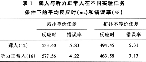 本研究所获得的研究结果表明,听力正常人在拓扑等价任务和拓扑不等价任务的反应时上存 在显著差异(F(1,15)=24.235,P=0.000)。结合原有研究和本研究的结果,我们 显然没 有办法在听力正常人身上拒绝陈霖的“拓扑性质知觉理论”对知觉加工所做出的理论假设。