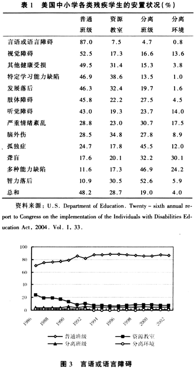 从上文可知,美国全纳教育的基本政策是为障碍儿童提供最少受限制的教育环境。在 这一政策的指导下,20多年来,普通班级的安置人数从20%多提高到近50%。不过,这一上升 主要表现在语言障碍的学生、特定学习能力缺陷的学生、肢体障碍和其他健康受损的学生群 体中。对于智力落后和重度感官障碍的学生群体来说,资源教室和分离班级仍然是主要的安 置方式,近年来智力落后学生安置在普通班级的比例只有11%左右,并有下降趋势。主要原 因是多年来的实证研究表明普通班级安置对于轻度学习能力缺陷的学生是有益的,不仅能促 进他们的社会学习,也能促进他们的认知发展并提高他们的学业成绩;但是,对于重度感官 障碍或智力落后的学生来说,有关研究并没有一致支持普通班级的安置方式[10]。