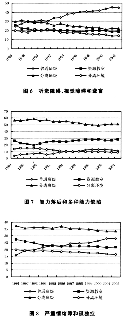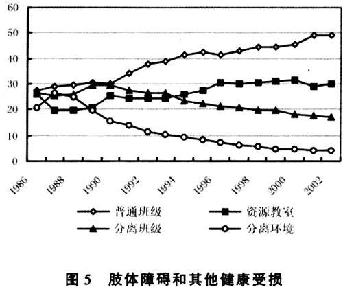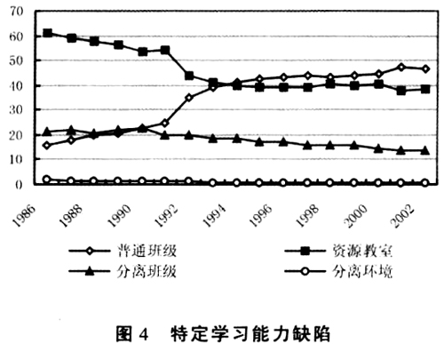 从图3可见,言语或语言障碍学生全纳教育程度起点高,上升快,趋势曲线到1993年 时已 进入十分稳定的状态,在普通班级就学的人数比例从那以后一直接近90%,分离环境安置的 百分比则低于1%。从图4可见,特定学习能力缺陷类学生的安置曲线在1993年前大幅度波动 :分离班级和分离环境的安置比例持续下降;资源教室安置的比例也大幅度下降,而普通班 级安置的比例则从16%速增到40%;1993年后各种安置的比例渐趋稳定,尤其是资源教室的安 置比例一直在40%上下,分离环境的安置比例一直等于或低于1%。