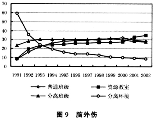 脑外伤学生的安置曲线比较平滑(见图9)。分离环境安置的比例在1996年前从59.3% 猛降到14.4%,其他3类安置比则呈会聚式上升,1996年时都在27%上下。从那以后,分离环 境安置比继续小幅度下降,资源教室安置比小幅度上升,2001年后成为最主要的安置形式; 另两类安置比则维持在同一水平。
