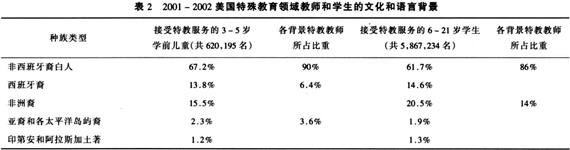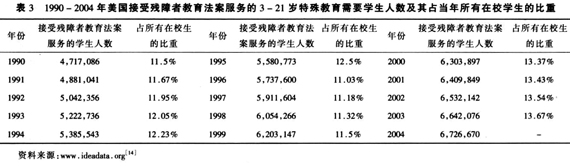 20世纪90年代以来,美国各类在校学生增长迅速,这一方面是由于战后婴儿潮时期出生者的 第三代已到入学年龄,另一方面是由于80年代的移民潮带来的移民子女的教育问题,以及由 此产生的多元文化教育需要。来自美国教育部(1998,1999,2000,2001)的资料显示,19 92-1999年,全美在校学生人数从68,860,000增至73,550,000,增长了6.8%;[9]同一时期 ,接受特教服务的3-21岁学生人数,则从5,042,356增长至6,203,147(见表三),增长率 为23%。可见,特殊教育需要学生的增长速度远高于所有在校学生的增长。然而,特教师资 并未 以与之同步的速度增长。以1992-1993和1998-1999学年为例。接受特教服务的在校学生( 3-21岁)分别为5,080,000和6,110,000,增长了20.3%;但公立学校的特教师资分别为357 ,521和386,133,仅增长了8.0%。[10]