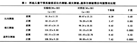 经过约一个学期的早期干预,实验组儿童的IQ均值较干预前均有所提高,而对照组儿童的IQ均值较干预前没有提高,甚至略有下降(见表3)。