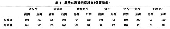 盖泽尔测验是发育测查,其结果发育商用DQ表示。发育商是心理年龄与生理年龄的比值。后测结果表明,实验组在适应性、语言、个人——社会领域的分数提高了,表明经过90个学时的干预训练,促进了这些领域心理能力的发展,加快了心理发展速度。
