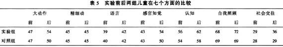 使用《儿童早期发展手册》在实验前后,分别对两组儿童进行七个方面的评估,结果见表5。