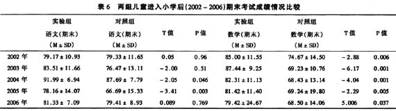 实验组和对照组的儿童,于2001年9月已经全部进入小学。之后,结束对实验组的任何干预活动,转入对实验组和对照组儿童的追踪与观察。如:对学习材料的心理适应能力测查、学生成绩和排次、留级和辍学率(通常高峰发生