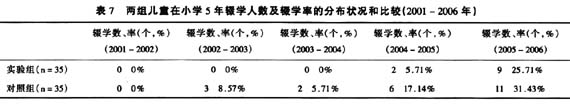 2001-2006年间,对照组有22名儿童辍学,占62.9%,实验组儿童有11名辍学,辍学率为31.4%,详见表7。