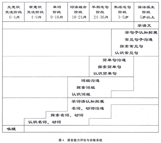 李孝洁、张磊、黄昭鸣等在结合现代语言病理学最新研究进展的基础上提出了我国 特殊儿童语言能力评估与训练的内容,具体如图4所示。语言能力的评估与训练是以语言障 碍和语言发育迟缓儿童的语言疾病的四个临床表现(语音、语义、语法、语用异常)来设计 的 ,以提高儿童的语言沟通能力。训练时根据正常个体语言发展的七个阶段,即①无意识交流 阶段(0-4个月),②有意识交流阶段(4-9个月),③单词阶段(9-18个月),④词语组合 阶段(18-24个月),⑤早期造句阶段(24-36个月),⑥熟练造句阶段(3-5岁)和⑦语法 派生阶段(5岁以上)来设定训练目标。各个阶段应达到的目标如图4所示: