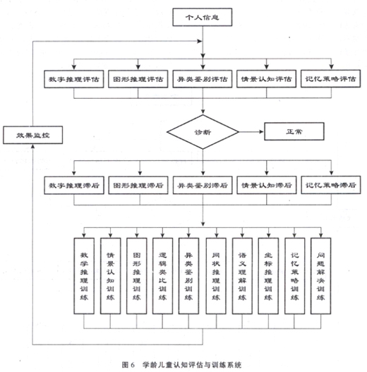 杜晓新、宋永宁、秦宁箴等在结合PASS理论的基础上提出了儿童五项认知能力评估及其训练 内容,即:认知能力评估和训练包括学前和学龄两个阶段[18],学前儿童认 知评估的内容包括空间次序、动作序列、目标辨认、图形推理、逻辑类比五个方面,训练内 容包括注意力、观察力、记忆力、数字认知、图形认知、序列认知、异类鉴别、同类匹配训 练等八项内容。具体如图5所示。