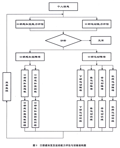 卢红云、肖永涛、郑钦、黄昭鸣等在结合现代康复医学最新研究进展的基础上提出 了我国特殊儿童口部运动异常矫治和训练的内容,具体如图9所示。口部运动异常矫 治主要 是通过自助或协助的促进技术对口部构音器官的运动异常(过度或受限)进行有针对性治疗, 以阻断它们的异常运动模式,建立正常运动模式,最终以提高口部构音器官的灵活性 、稳定 性和协调性为目的。它强调口部各个构音器官的生理运动以及彼此之间的协调运动。