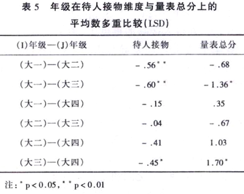 本研究发现,大三的学生困扰程度最深,大四的学生困扰程度最低,大一、大二居中间。这 与以往的研究[9,10]基本一致。大一的学生年龄相对较小,从家乡来到一个陌生 的环境里, 很容易产生孤独感与焦虑感,有着强烈的与人交往与沟通的情感需求;另外,大一学生与交 往对象之间相处的时间还不太长,交往不深,对彼此的缺点和不足还很没有深入的了解,彼 此之间的利益竞争和冲突还不是很多。目前,在高校心理健康教育中,普遍存在重视低年级 而较为忽视高年级大学生的现象。因此,大一学生人际关系行为困扰程度不深。随着时间的 推移,大学生交往对象越来越广泛,彼此之间交往更深,关系更为复杂,到大三的时候,人 际关系困扰表现最深。大三是大学四年中最关键的一个年级,因为这个阶段大学生要面临着 自己的人生抉择,是考研还是找工作。大学生的时间、精力有限,或受经济条件的影响,大 三学生必须要在这两者之中做出取舍,从而体验着双趋式心理冲突,心理压力大。这可能会 对他(她)们的人际关系行为带来不利的影响。到了大四,特别是下学期,大部分学生的去 向可能已基本定型,或者已经找好了工作,或者考研成功;考研如果没有成功,也可能有了 下一步的打算。再加上,即将毕业,大四学生感觉分手在即,心中会涌起一些惆怅和忧伤, 这会使他(她)们更加珍惜在一起的最后一段时光,从而导致人际关系困扰程度的降低。从 这个结果来看,大三学生应是心理咨询与心理健康教育的重点对象。