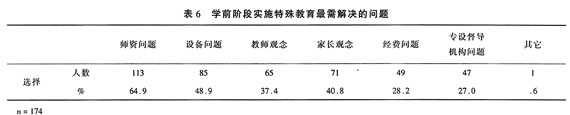 学前阶段的特殊教育目前仍然是个很薄弱的环节,还有很多问题尚未解决。调查结果显示,全体样本对学前阶段特殊教育最需解决的问题。按选择人数占总人数的多少,依次为师资问题(64.9%)、设备问题(48.9%)、家长观念(40.8%)、教师观念(37.4%)、经费问题(28.2%)以及专设督导机构问题(27.0%)等(见表6)。由此可见,师资、设备、家长观念以及教师观念是目前学前阶段实施特殊教育最需解决的问题。