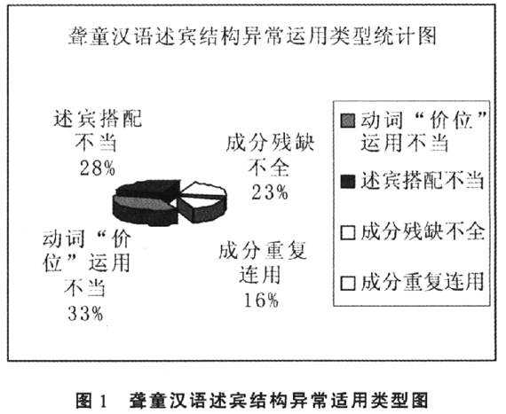 在聋童汉语述宾结构异常运用的四种类型中,“动词‘价位’运用不当”在聋童的书面语表 达中是出现最多的类型;其次是“述宾搭配不当”的问题,“述宾搭配不当”的类型中又以 “述语动词运用不当”表现最为突出;在“成分残缺不全”的类型中,最常见的是“述语动 词残缺”;“成分重复连用”句式类型也占相当的比例。