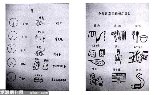 视觉流程表能够用于协助计划一段时间内(上午、下午、一天或一周)要从事的活动,如图。视觉流程表把抽象的概念以清晰、稳定而具体的形式加以呈现,能够有效地增进儿童对于活动的理解,提高他们对于活动的预期并降低焦虑。根据儿童的理解程度,流程表上呈现的视觉支持物可以从实物(整个实物、缩小的实物、部分实物)到相对应的照片,再到图片符号(如简笔画)。此外,还可以根据儿童的能力水平来确定时间表的长度和活动的数量。