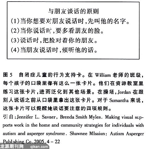 行为支持图表规定了行为的相关原则,以及不遵从这些原则的后果。它能促进儿童对于社会情境的意识和理解。如图5119]提示的是儿童在与朋友谈话时应该掌握的技巧,而图4示范的则是“分享”的原则。