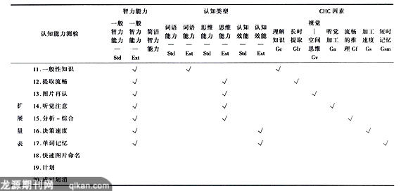 以CHC理论为基础的认知能力测验首推WJ-Ⅲ智力能力测验。它是WJ系列测验的第三版,也是CHC理论公诸于众的基础。分为WJ-Ⅲ认知能力测验(简称WJ-ⅢCOG)和WJ-Ⅲ成就测验(简称WJ-ⅢACH),该测验测量了CHC理论框架下的十个广泛能力。WJ-ⅢCOG测量了七个广泛能力,另外的几个广泛能力在WJ-Ⅲ成就测验中得到体现。WJ-ⅢCOG测验包括标准测验(测验1-测验10)和扩展测验(测验11-测验20),每个分测验都测量了至少一个狭窄能力。因此这些测验可以划归为不同的广泛能力之下,具体内容详见表1。