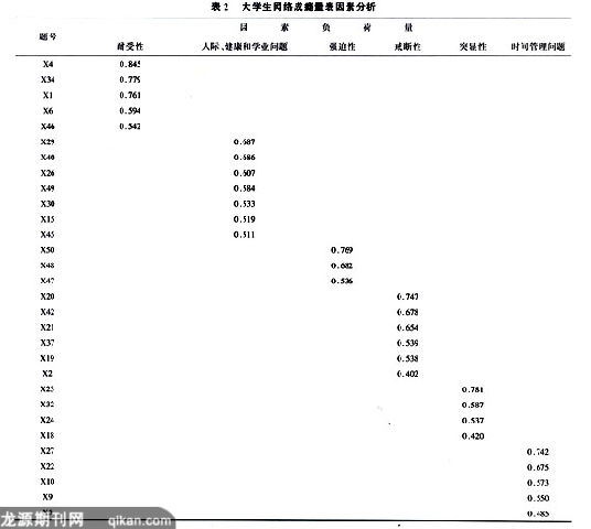 以主成分分析法抽取因素,并以最大变异法进行正交旋转,将网络成瘾量表各题目进行因素分析,共抽取6个因子,所有题目的因素负荷均大于0.4,故全部保留,见表2。