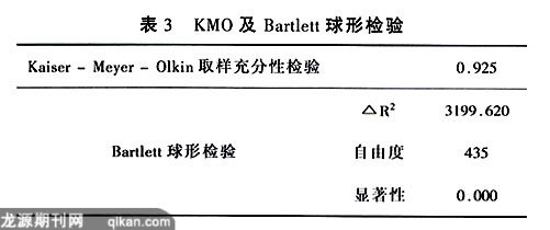 根据学者Kaiser(1974年)观点,当KMO值愈大时,表示变量间的共同因素愈多,愈适合进行因素分析,如果KMO的值小于O.5时不宜进行因素分析,此处的KMO值为0.925,适合进行因素分析。此外,Bartlett球形检验的x2值为3199.62(自由度为435),达显著,代表母群体的相关矩阵间有共同因素存在,适合进行因素分析。在不限定因素的层面下,以主成分分析法并配合最大变异法(Varimax)进行正交旋转(orthogonal rotation),特征值大于l的因子共有六个。六个因子的特征值为12.41,1.81,1.469,1.361,1.262,1.069,其解释变异量分别41.367%,6.032%,4.987%,4.535%,4.205%,3.564%,累积的解释变异量为64.601%,基本上代表了量表的整体结构。