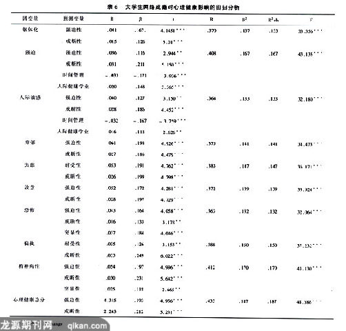 从表6可以看出:大学生网络成瘾量表各因子能够显著预测躯体化、强迫、人际关系敏感、抑郁、焦虑、敌意、恐怖、偏执、精神病性以及心理健康总分,也就是说大学生网络成瘾容易引起心理健康问题。