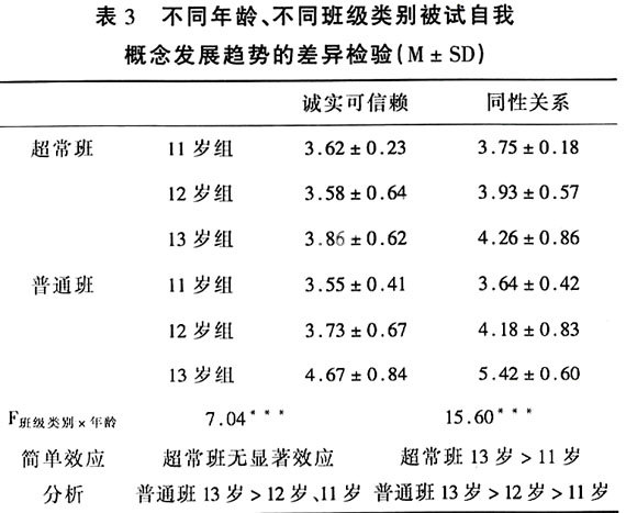 交互作用显著的维度有诚实可信赖自我概念与同性关系自我概念,说明超常班与普通班的诚实可信赖和同性关系自我概念的发展并不一样。简单效应分析表明,在诚实可信赖自我概念的维度上,11岁和12岁组内超常班和普通班的比较没有显著差异,而13岁组内普通班显著高于超常班。超常班的年龄主效应不显著,普通班的年龄主效应显著,其中13岁组显著高于11岁和12岁组,11岁组和12组之间没有显著差异。