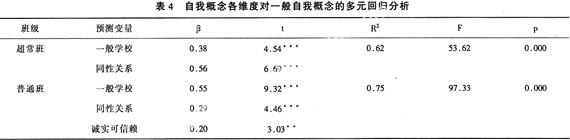 无论是超常班和普通班,自我概念的各维度均与一般自我概念有显著相关。本研究分别以超常班、普通班的一般自我概念为因变量,采用多元同时回归的统计方法考察了自我概念其他维度对其一般自我概念的预测作用。从表4中可见,对超常班而言,一般学校和同性关系自我概念对一般自我概念有显著的正向预测作用,解释率为38%和56%。对普通班而言,一般学校,同性关系和诚实可信赖自我概念对一般自我概念有显著的正向预测作用,解释率分别为55%、29%和20%。