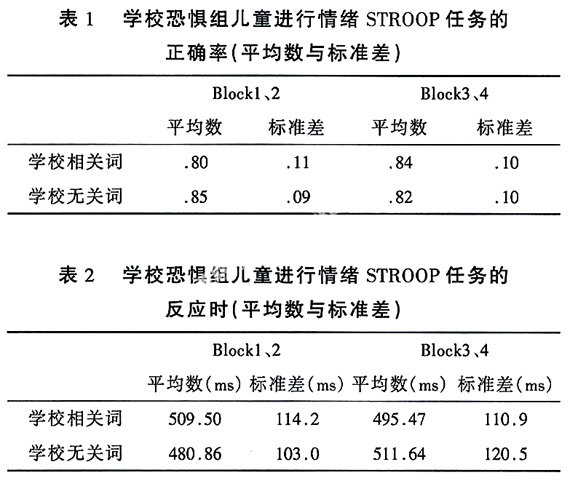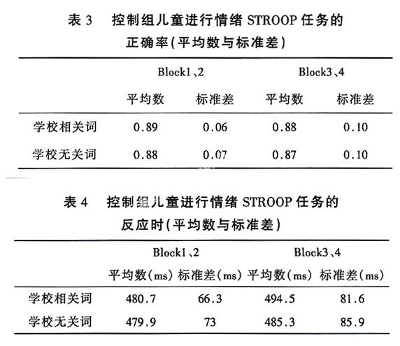实验二采用普通控制组儿童为被试,考察他们是否对学校相关词产生注意偏向。从这三种量表的得分可以看出,控制组儿童并没有显著的情绪焦虑,未出现明显的反社会行为,虽然这些儿童也有不爱上学的情况,但造成他们不去上学的首要原因不是学校相关刺激引起的负性情绪,由此我们可以判断,控制组儿童未达到临床上诊断学校恐惧的标准。