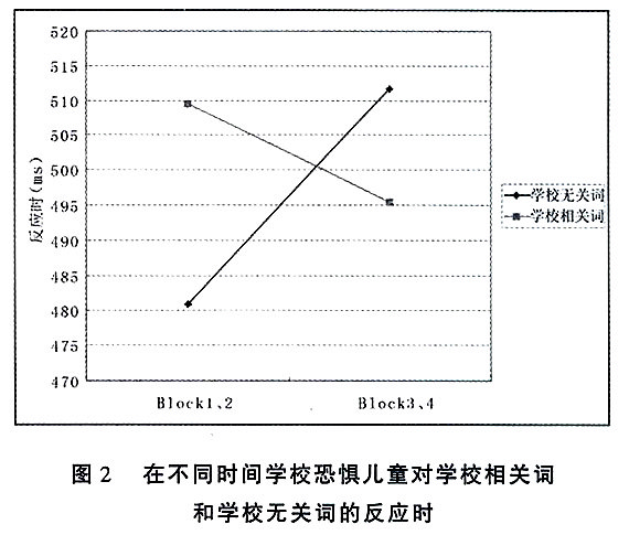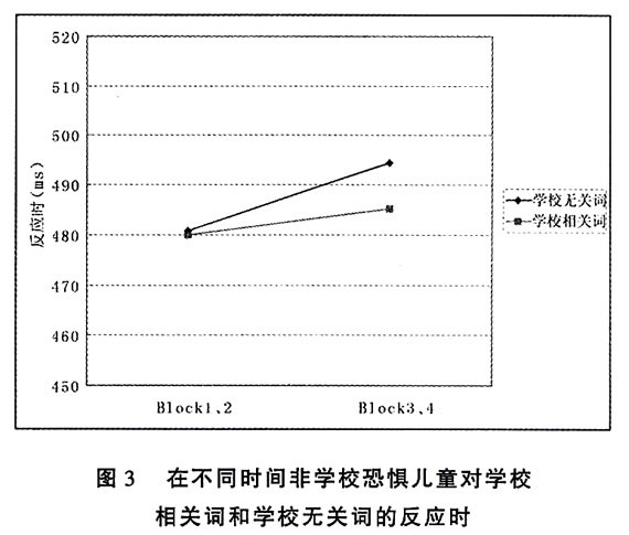 从简单效应分析结果来看,首先,在时间段的两个水平上,词类的两个水平分别表现出差异显著的趋势。在实验的前半段Block1、2中,学校恐惧儿童对学校相关词的反应速度显著慢于对学校无关词的反应(p<0.01),充分表现出他们对学校相关词的注意偏向。而在实验的后半段Block3、4中,这种差异发生了逆转,学校恐惧儿童对学校相关词的反应变快,对学校无关词的反应变慢,并且前者快于后者。差异达到边缘显著(p=0.055)。