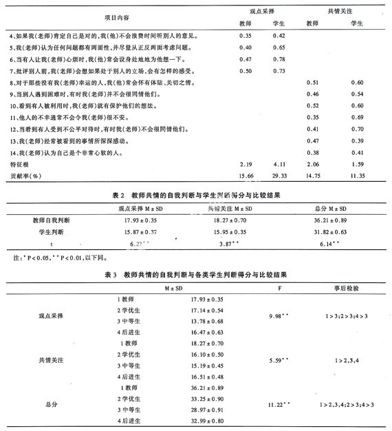 对学生与教师相对应的分数进行配对,即每15名学生对应一位教师,然后在观点采择与共情关注及总分上检验,结果发现教师的自我判断得分显著高于学生的判断。
