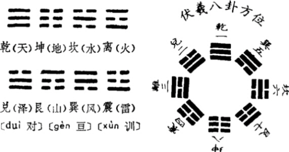 八卦是古人用以占卜的八种基本图形,由符号“——”和“— —”组成。这些图形的名称及所代表的事物,见图2所示。用这些图形进行排列组合,可以表达更复杂的意义。中国最古老的经典之一—— 《易经》,对八卦有着系统的论述。据说,著名的德国科学家、发明计算机的先驱莱布尼兹(Leibniz,G. W.,公元1646—1716年)就曾经从《易经》的八卦图像中欣喜地印证了从0到63的二进位数字。
