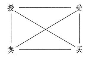 上述“授与受”是一对对立项;“授与买”是一对矛盾关系,以此类推,当然还可以代入其它具体的实项来反映不同文本的意蕴。在格雷马斯方阵中,对立关系是一对基本关系,矛盾关系是辅助关系。正是靠着这四个功能项(也可以是角色)之间上述两类关系及其种种变体,文本的意义得以衍生。
