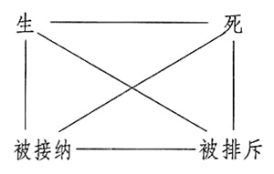在文本中,阿姆布罗瑟的悲剧是由他的“生”开始,继而为修道院所“接纳”,然后遭遇“排斥”,最后达至“死亡”这样一个顺序而展开的。阿姆布罗瑟是埃尔韦拉的私生子,其父母的结合并未被社会所认同,所以阿姆布罗瑟的贵族爷爷将他抱走后便把他丢到了修道院的门口。可以说,阿姆布罗瑟自出生之日起便是一个没有身份,被家庭和社会排斥在外的人。在修道院的围墙中,他过了三十年苦行僧式的生活,终于以渊博的知识、雄辩的口才获得马德里居民的敬仰。然而他在众人心目中,是以一个没有缺点、没有欲望、高高在上的“圣人”形象存在的,除了布道和聆听忏悔之外,阿姆布罗瑟始终处在修道院封闭的小圈子里,被隔绝在普通人的生活之外。社会表面上接纳了他“圣者”的身份,但实际上是将他当作连男女区别都不知道的“异类”排斥了出去,使他处于福柯所说的“被监禁”、“被隔离”的状态。在阿姆布罗瑟把灵魂出卖给魔鬼之后,甚至连选择地狱的话语权也丧失了,魔鬼仅仅把他当作一个试验品玩弄之后就毁灭了他。阿姆布罗瑟死后,马德里人很快就将他忘记了,仿佛他那显赫的名声根本不存在一样。所以,该文本的丰富内涵衍生于阿姆布罗瑟“被接纳”与“被排斥”的过程中,而在由上述方阵中的四个义项所产生的六组关系中,最重要的是“生”与“被排斥”这一对矛盾关系。由此,《僧侣》便呈现出了这样的意义指向:即不论作者主观上如何,它事实上表达的是人“生”而被“排斥”的境遇,敞开的是生存的被隔离、被排斥状态,是人的孤独无助和人与人无法沟通交流的“存在主义”主题。