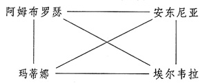回到格雷马斯方阵,与刚刚列出的关系方阵不同,人们事实上更易于以角色作义项来“布阵”。例如以阿姆布罗瑟和安东尼亚为主要对立项,以双方的助手和对手为辅助项布阵如下: