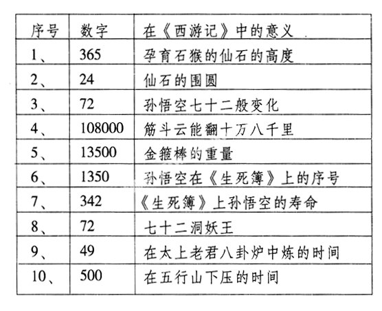 在《西游记》中,一些跟孙悟空有关的数字都显得十分神秘。在《西游记》第一回,敷衍石猴来历的时候,说道“花果山”乃“十洲之祖脉,三岛之来龙”,而孕育石猴的仙石,“有三丈六尺五寸高,有二丈四尺围圆”。小说接着解释为什么是这个数字:“三丈六尺五寸高,按周天三百六十五度;二丈四尺围圆,按政历二十四节气”,并且提到仙石“上有九窍八孔,按九宫八卦”。这样一系列的描写,就为石猴安排了一个“神猴”的出身。