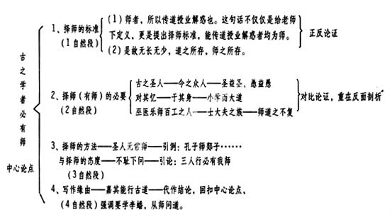 明确:文章开门见山提出中心论点,接着从正面提出择师的标准,再用对比的手法剖析择师的必要,重在反面陈述利害,继而以孔子为例提出择师的方法与态度,正面论述,最后以交待写作缘由回扣中心论点,代作结论。