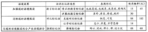 总之,话语标记语相应地分为换言标记语、对比标记语、推理标记语三类,其形式与功能如表: