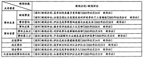 这是对新闻事件进行分析评论时常用的联结方式。指分别针对新闻事件的不同环节和要素所进行的新闻分析或新闻评论。除了对事件本身发表评议之外,还对事件背景、后续事件甚至相关事件发表分析或评论。这类方式在针对同一核心事件的多篇分析或评论中比较常见,应该算作“各环凸现”中的一个特殊小类,但因为是针对新闻分析和评论来说的,所以我们单独列出来。如分别对“伊拉克战争”的事件整体、后续事件、相关事件和预告事件进行分析或评论,见表-2。