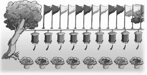 1. 师:(出示教材例1场景图)大家看,这是艺术节时同学们布置会场的一幅图片,从图中,你都看到些什么?(盆花、彩灯、彩旗,见下图)
