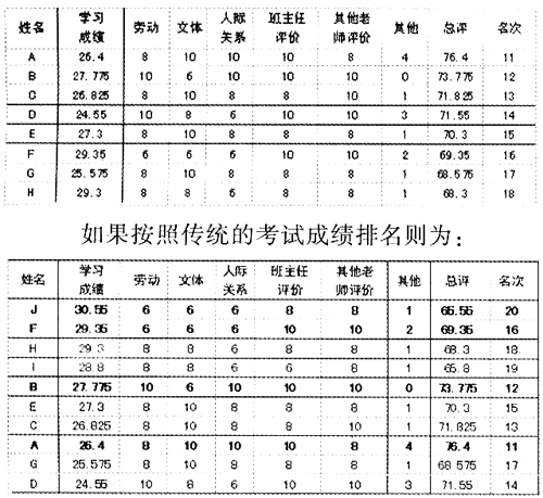 从传统的排名方式我们可以看出,J和F学习成绩比较不错,排在11和12位,但按照综合测评却排在了20和16位,年终评优时校级三好生12名,如果只排考试成绩,J和F应在表彰之内,但严格执行综合测评制度,所以A和B而不是J和F被评为了三好生。