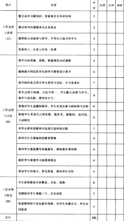 评价采用个人自评和学校评价相结合。后者由年级组长、学校教科研室主任和学校负责人一起,在听取各方面意见后讨论评定。评价以质性评价为主,采用等级评定的模糊评价方法。