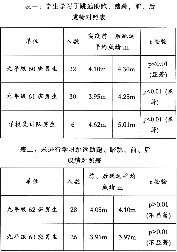 该方法设计后,我以一个学期的开学初和期末所测数据进行比照。九年级60班、61班男生和学校田径集训队男生跳远教学和训练中进行了实践、检验、效果显著。而在九年级62、63班没有进行该方法练习,检验的效果不明显。其实践效果从两个方面来检验。