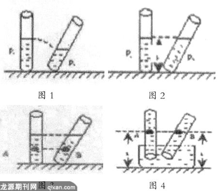 5.变通基题。传统教学强调“一题多解”、“多题一解”,确实也能起到激活学生思维的作用,但在一定程度上加重了学生的负担。而变通基题则是指基于同一问题情境,改变题目的条件和要求,这样既能减轻学生的负担又能让学生提高把握概念内涵的能力。例如在运用液体压强概念、公式时,采用变通基题的方法促进学生思维,进而促使学生更好地把握概念的内涵。基题:在水平桌面上有一支竖直放置的试管,里面装有一定量的水,此时水对试管底的压强为p1,当它慢慢倾斜到如图1位置时,水对试管底的压强为p2,请比较,p1和p2的大小。①变式一:如图2,当两支试管内装同种液体且液面相平,请比较,p1和p2的大小。②变式二:如上图两支试管中,内装质量相等的不同液体且液面相平,请比较,p1和p2的大小。③变式三:如图3两支试管中,若两试管底受到的液体压强相等,那么,请比较在与水平面距离相等的A、B两点的压强大小。④变式四:如图4两支试管倒置在水槽中(试管内无气体进入),请比较在与水平面距离相等的A、B两点的压强大小。