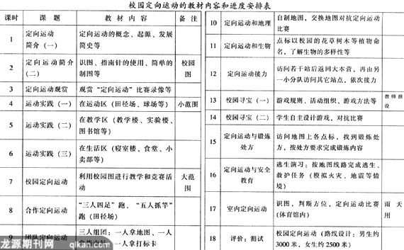 1.组织形式。打破行政班授课制,采用走班授课的组织形式。每学期开学初把列入校本课程计划的“课程简介”公示给学生,由学生根据需要选择学习。2007学年第1学期(9月初)共推出9个校本课程,期中选修“校园定向运动”的学生共计205人,高一段123人编成3个班,高二段82人编成2个班。每周一至周五下午的第三节课为体育校本课程——“校园定向运动”。