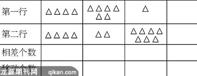 教师由此引导学生研究“移动个数与相差个数有什么关系”这一问题,并提醒学生可以用摆学具的办法来研究,也可以看着下面表二中的图来研究,甚至可以不用任何材料。