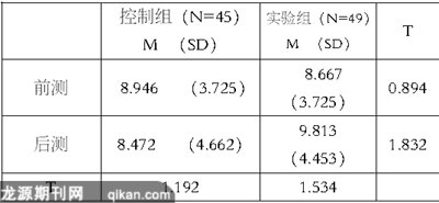 在相同的动机测试内容下,控制组在前后测验中都没有显著差异,而实验组在前后测结果上存在差异,但不显著(T=1.834 P<.1);并且后测中实验组与控制组存在差异,但不显著(T=1.532 P<.1)(表二)。