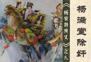 杨衮之子杨继业,娶妻佘赛花。夫妻二人归宋后,南征北战,威名远震。杨继业为边关八大令公之一,人称杨令公;佘赛花生有七子,并收一义子,人称余太君。辽兵犯境,潘仁美挂帅,杨继业为前部先锋。他带领七郎八虎大战金沙滩,救驾立功,连伤三子。潘仁美官报私仇,害死杨七郎,杨令公被困两狼山,碰碑而死。 |